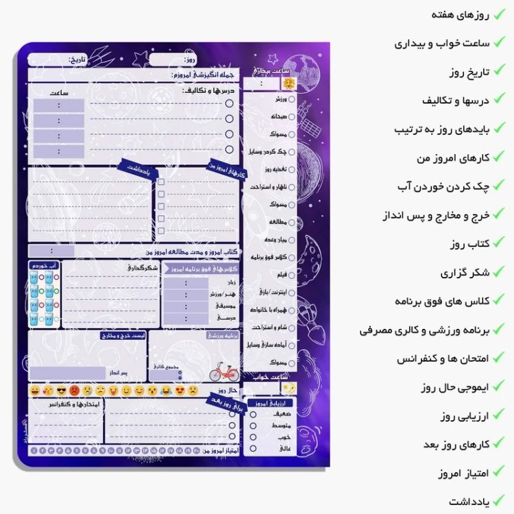 دفتر برنامه ریزی مستر راد طرح کهکشان مدل پلنر تحصیلی📝 ✅️توضیحات : 🌸 جنس : 80 گرم اندونزي 🌸 تعداد صفحات : 90برگ 🌸 زبان : فارسي 🌸 نوع جلد : منعطف، دو رو سلفون 🌸 ابعاد تقريبي : cm 20*15 🌸نوع صحافي : فنر مارپيچ