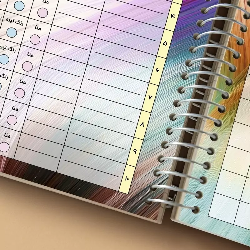 دفتر نوبت دهی رنگ مو مستر راد طرح طیف رنگی جلد سخت ✅️توضیحات : 🌸جلد سخت 🌸75 برگ 🌸سایز :20*15 سانتی متر