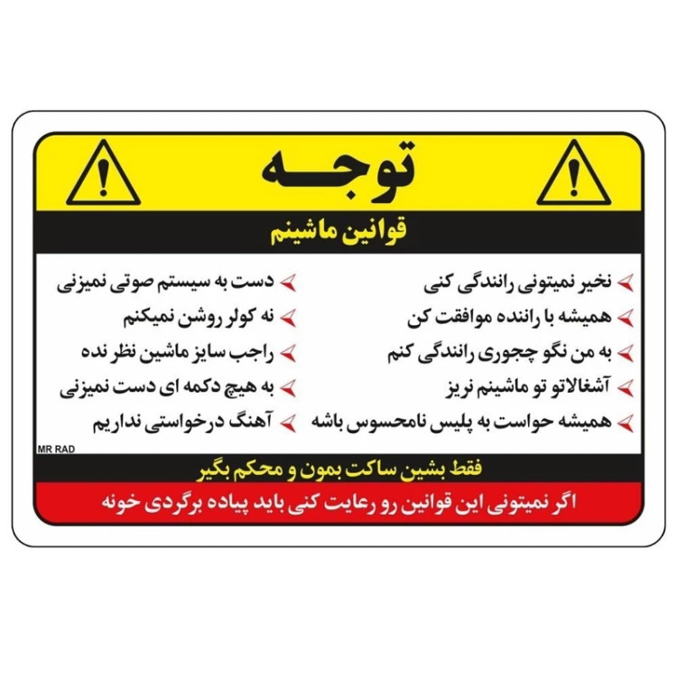 برچسب بدنه خودرو مستر راد طرح اخطار تعداد 2 نوع آرم :برچسب تزئینی جنس: پلاستیک ابعاد: 6×9 مقاوم در برابر آب ، نور خورشید و در برابر دما این برچسب ها از جنس pvc، قابل شستشو و ضد خش