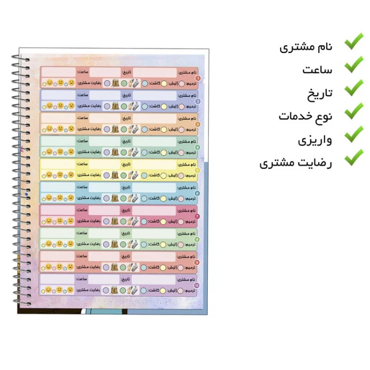دفتر نوبت دهی ناخن مستر راد مدل لاک ژل 💅 ✅️توضیحات 🌸20×15 سانتی متر 🌸فنر ما پیچ 🌸75 برگ 🌸80 گرم اندونزی 🌸جلد سخت 🌸گالینگور ✅️گروه هنری مستر راد در تلاش است تا هر روزه محصولات جدید و جذابی برای دوستداران عزیز تولید کند. محصولاتی با کیفیت عالی تا افتخاری از تولید داخلی باشند 🌼مستر راد برای بهترینها