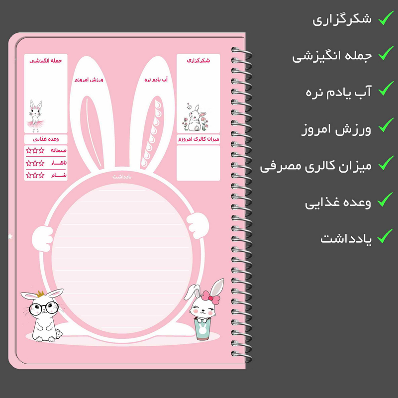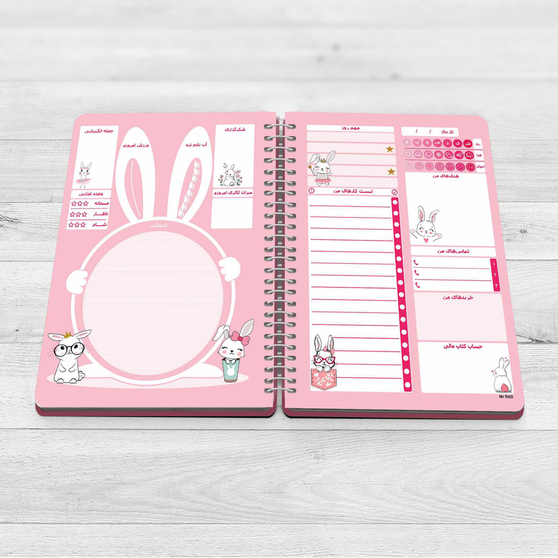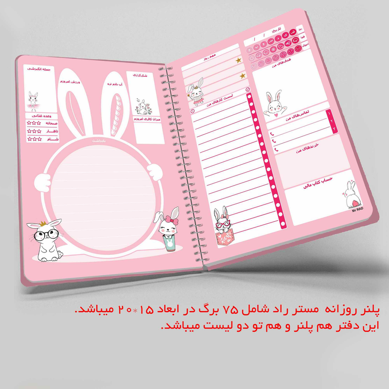 دفتر برنامه ریزی مستر راد طرح خرگوش فانتزی صورتی ✅️توضیحات : 🌸جنس : کاغذ 80 گرم اندونزي 🌸تعداد صفحات : 75 برگ 🌸زبان : زبان فارسي 🌸نوع جلد : جلد منعطف دو رو سلفون 🌸ابعاد تقريبي : cm 15*20 🌸نوع صحافي : صحافي فنر مارپيچ