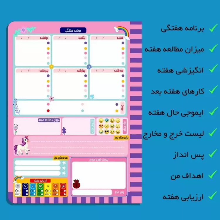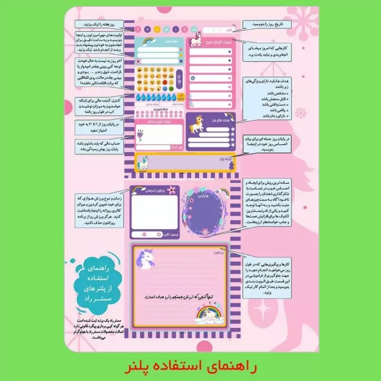 ✅️مجموعه سه عددی پلنر، دفترچه و کاغذ یونیکورن مستر راد 🎁مناسب برای کادو 🎁 💥👌جلوگیری از سردرگمی در طول روز ✅️اولین مزیتی که استفاده از پلنر برای شما دارد، نجات از سردرگمی در طول روز است. فرض کنید که صبح از خواب بیدار میشوید و هیچ برنامهای هم ندارید. به صورت شانسی هر کاری به ذهنتان رسید انجام میدهید و خبر ندارید که کارهای مهمتری هست که باید سریعتر انجام دهید. همچنین نمیدانید که برای انجام یک کار مشخص چقدر زمان دارید. در نتیجه کاری که نهایتاً یک ساعت زمان میخواهد، ممکن است 4 ساعت از زمان شما را بگیرد. بنابراین با استفاده از پلنر میتوانید با یک ذهن منظم و برنامه دقیق به استقبال روز بروید.