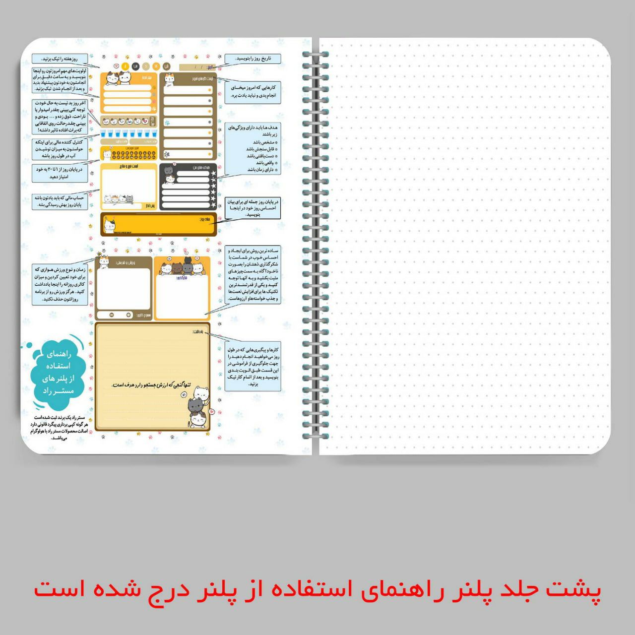 دفتر برنامه ریزی مستر راد طرح جدید گربه فانتزی مدل پالت سفید ✅️توضیحات : 🌸جنس : تحرير 80 گرم 🌸تعداد صفحات : 75 برگ 🌸زبان : فارسي ابعاد تقريبي : 20*15 سانتيمتر 🌸نوع صحافي : فنر مارپيچ