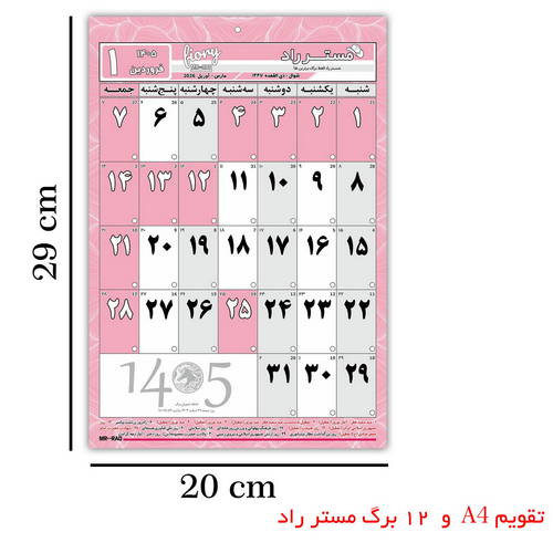 تقویم دیواری سال 1405 مستر راد طرح مدیریت زمان به همراه برچسب نشانگر📆 ✅️توضیحات : 🌸 تقويم ديواري سال1405 مستر راد 🌸طرح مديريت زمان تقویم دیواری مستر راد شامل 12 برگ A4 است که با طراحی ساده و کاربردی تولید شده و مناسب برای نوشتن یادداشت های روزانه میباشد. این تقویم شامل همه تعطیلات رسمی کشور و مناسبت های مهم فرهنگی، هنری، اجتماعی و مذهبی به تفکیک هر ماه می باشد. در ساخت و طراحی این محصول از کاغذ نوع گلاسه استفاده شده که از مقاومت و کیفیت بالایی برخوردار است. از ویژگی های منحصر به فرد این محصول فونت چاپی بزرگ آن است که به راحتی از فاصله 3 متری قابل خواندن است و برای افراد مسن و افرادی که ضعف بینایی دارند بسیار مناسب است 🍀 مستر راد فقط برای برترینها همراه برچسب نشانگر