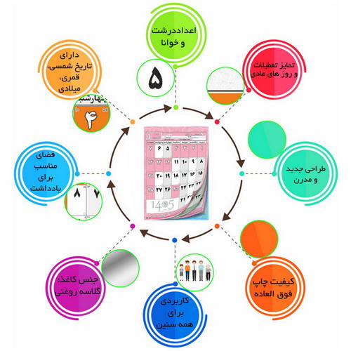 تقویم دیواری سال 1405 مستر راد طرح مدیریت زمان به همراه برچسب نشانگر📆 ✅️توضیحات : 🌸 تقويم ديواري سال1405 مستر راد 🌸طرح مديريت زمان تقویم دیواری مستر راد شامل 12 برگ A4 است که با طراحی ساده و کاربردی تولید شده و مناسب برای نوشتن یادداشت های روزانه میباشد. این تقویم شامل همه تعطیلات رسمی کشور و مناسبت های مهم فرهنگی، هنری، اجتماعی و مذهبی به تفکیک هر ماه می باشد. در ساخت و طراحی این محصول از کاغذ نوع گلاسه استفاده شده که از مقاومت و کیفیت بالایی برخوردار است. از ویژگی های منحصر به فرد این محصول فونت چاپی بزرگ آن است که به راحتی از فاصله 3 متری قابل خواندن است و برای افراد مسن و افرادی که ضعف بینایی دارند بسیار مناسب است 🍀 مستر راد فقط برای برترینها همراه برچسب نشانگر