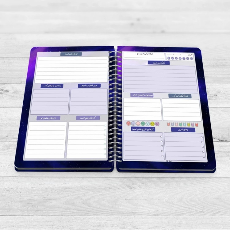دفتر شکر گزاری مستر راد طرح نیایش مدل کهکشانی چند رنگ🌌 ✅️توضیحات : 🌸 جنس : کاغذ 80گرم اندونزي 🌸تعداد صفحات : 75 برگ 🌸 زبان : زبان فارسي 🌸 نوع جلد : جلد منعطف دورو سلفون 🌸 ابعاد تقريبي : cm 20*15 🌸نوع صحافي : صحافي فنر مارپيچ