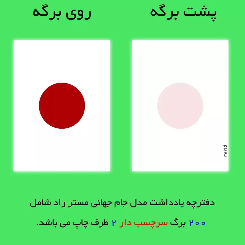 کاغذ یادداشت مستر راد طرح پرچم ژاپن سفید📝 ✅️توضیحات : 🌸ابعاد:7.5×10سانتیمتر 🌸تعدادصفحات:200برگ 🌸جنس کاغذ:تحریر 80گرم 🌸دارای سرچسب دار 🌸دوطرف چاپ 🌼مستررادبرای بهترین ها